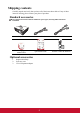 Shipping contents Carefully unpack and verify that you have all of the items shown below. If any of these items are missing, please contact your place of purchase. Standard accessories The supplied accessories will be suitable for your region, and may differ from those illustrated. Projector Power Cord VGA Cable Multi-language user manual DVD Quick Start Guide Remote Control & Batteries Optional accessories 1. 2. 3.