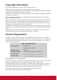 Copyright Information Copyright © ViewSonic® Corporation, 2013. All rights reserved. Macintosh and Power Macintosh are registered trademarks of Apple Inc. Microsoft, Windows, Windows NT, and the Windows logo are registered trademarks of Microsoft Corporation in the United States and other countries. ViewSonic, the three birds logo, OnView, ViewMatch, and ViewMeter are registered trademarks of ViewSonic Corporation. VESA is a registered trademark of the Video Electronics Standards Association.