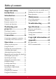 Table of contents Important safety instructions .......................2 Using the projector in standby mode. 37 Shutting down the projector .............. 38 Menu operation.................................. 39 Introduction......................4 Maintenance ...................48 Projector features ................................. 4 Shipping contents................................. 5 Projector exterior view......................... 6 Controls and functions .........................