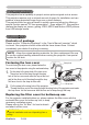 Maintenance Maintenance Lamp A lamp has finite product life. Using the lamp for long periods of time could cause the pictures darker or the color tone poor. Note that each lamp has a different lifetime, and some may burst or burn out soon after you start using them. Preparation of a new lamp and early replacement are recommended. To prepare a new lamp, contact your dealer and tell the lamp type number. Type number : RLC-027 Replacing the lamp The lamp cover the projector off, and unplug the power cord. 1.