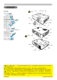 各部件名称 各部件名称 投影机 (1) 灯罩 ( 51) 内含灯泡单元。 (2) 对焦环 ( 18) (3) 变焦环 ( 18) (4) 控制面板 ( 5) (5) 脚撑调校钮 (x 2) ( 18) (6) 脚撑 (x 2) ( 18) (7) 遥控传感器 ( 13) (8) 镜头 ( 18, 54) (9) 镜头盖 ( 3) (10) 进风口 (11) 过滤器盖 ( 53) 内含空气过滤器和进风口。 (12) 扬声器 ( 35) (13) 排风口 (14) 交流电插口 ( 12) (15) 电源开关 ( 15) (16) 后面板 ( 5) (17) 安全条 ( 12) (18) 安全槽 ( 12) 高温! (1) (2) (3) (4) (6) (11) (8) (5) (9) (6) (7) (10) (6) (6) (10) (11) 高温! (13) (12) (4) (18) (14) (16) (15) (17) (13) (1) 警告 ► 高温! : 在使用时或刚使用完后,请勿触摸灯泡盖和排风口的四周, 因它温度很高。 ► 在灯泡点亮时请勿窥视镜头或通风口内