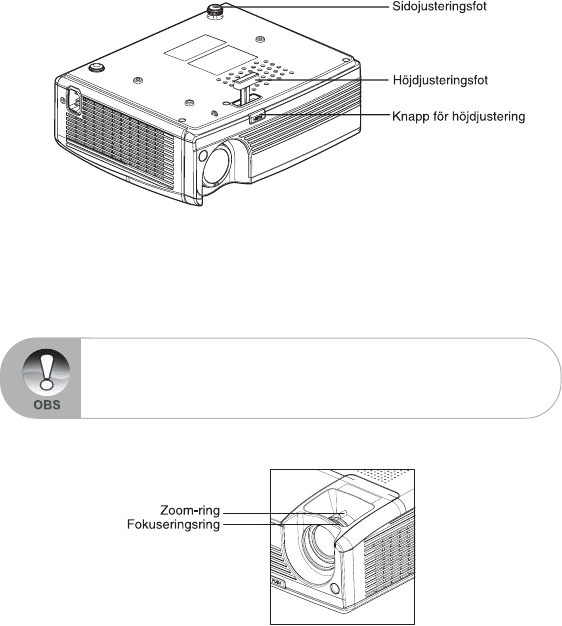 För att undvika att skada projektorn bör höjdjusteringsfoten och