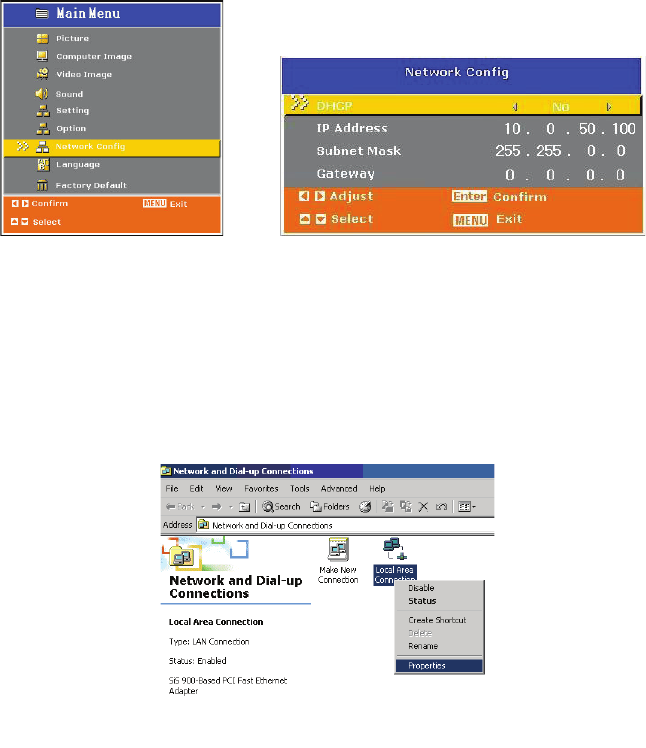 1. Aktivera DHCP i projektorns skärmmeny under Network Cong.