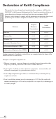 Declaration of RoHS Compliance English This product has been designed and manufactured in compliance with Directive 2002/95/EC of the European Parliament and the Council on restriction of the use of certain hazardous substances in electrical and electronic equipment (RoHS Directive) and is deemed to comply with the maximum concentration values issued by the European Technical Adaptation Committee (TAC) as shown below: Proposed Maximum Concentration Actual Concentration Lead (Pb) 0.1% <0.
