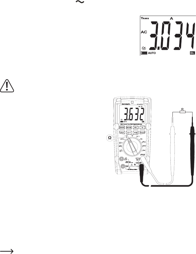Pour la mesure de courants alternatifs (A ), procédez comme décrit préalablement.