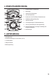 4. INDIVIDUAL PARTS DESCRIPTION 1 Analog display with mirror scale 2 Scale indicator 3 Adjustment screw for scale indicator 4 10A current measuring socket 5 Measuring function rotary switch 6 COM socket (reference measuring point) 7 V/Ω/mA/Hz socket 8 0 ohm adjustment knob for resistance measurement 9 Vrms/Vp-p button for voltage measurement 10 Rubber guard (sides), stand (back) and integrated battery compartment 11 Power indicator 5.