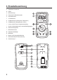 8. Display-Angaben und Symbole Folgende Symbole und Angaben sind am Gerät oder im Display vorhanden. Andere Symbole können im Display vorhanden sein (Displaytest), diese haben jedoch keine Funktion. 1 Echt-Effektivwertmessung 12 Messwertanzeige 2 Delta-Symbol für Relativwertmessung (=Bezugswertmessung) 13 Symbol für den Diodentest 3 Symbol für Mega (exp.6) 4 Symbol für Kilo (exp.