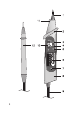 Scope of delivery Pen-typ multimeter with batteries 2 replacement button cells 1 replacement fuse (only VC-86) 1 replacement prod 70 mm in length 1 crocodile clamp (scew-on) Carry bag Operating instructions Operating elements (see fold-out page) 1 Test tip, screw-off (plus pole + at DC measurement) 2 Front covering flap with grip protection collar 3 Data hold button 4 Range Hold button 5 Select button 6 LCD 7 Low-impedance button (MAX button for VC-82) 8 Rear covering flap (battery compartment) 9 Connectin