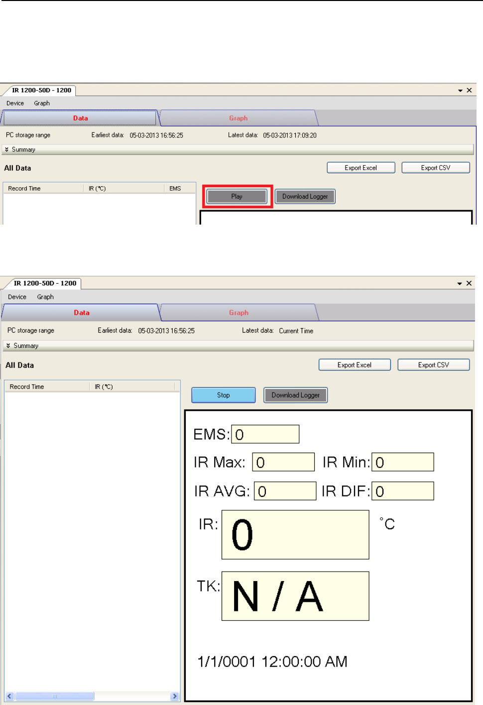 Click the “Play” button in device control panel will switch IR 1200-50D / IR 1201-50D into real