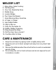 MELODY LIST 1. Mary, Mary, Quite Contrary 2. Old King Cole 3. One, Two, Buckle My Shoe 4. Riddle Song 5. London Bridge 6. Pop! Goes the Weasel 7. Good Morning Merry Sunshine 8. A-Tisket, A-Tasket 9. Hey Diddle Diddle 10. Skip to My Lou 11. Polly Put the Kettle On 12. Diddle, Diddle, Dumpling 13. Ring Around the Rosy 14. Did You Ever See a Lassie? 15. One Man Went to Mow CARE & MAINTENANCE 1. Keep the unit clean by wiping it with a slightly damp cloth. 2.