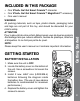 INCLUDED IN THIS PACKAGE WARNING: All packing materials, such as tape, plastic sheets, packaging locks and tags are not part of this toy, and should be discarded for your child’s safety. ATTENTION Pour la sécurité de votre enfant, débarrassez-vous de tous les produits d’emballage tels que rubans adhésifs, feuilles de plastique, attaches et étiquettes. Ils ne font pas partie du jouet. NOTE: Please keep this user’s manual as it contains important information. GETTING STARTED BATTERY INSTALLATION 1.