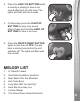3. Press the LIGHT UP BUTTONS while a melody is playing to hear a fun sound effect jam into the tune. The lights will flash with the sounds. 4. Continuously press the LIGHT UP BUTTONS to play a fun sound effect. Press and hold the LIGHT UP BUTTONS to hear a fun tune. 5. Press the ON/OFF HEART BUTTON again to turn the unit OFF. You will hear a closing tune before the unit switches off. The lights will flash with the sounds. MELODY LIST 1. 2. 3. 4. 5. 6. 7. 8.