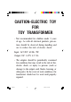 CAUTION-ELECTRIC TOY FOR TOY TRANSFORMER - Not recommended for children under 3 years of age. As with all electrical products, precautions should be observed during handling and use to reduce the risk of electric shock. Input: AC120V 60 HZ 9W Output: DC 14.5V 4.5 VA - The adaptor should be periodically examined for conditions that may result in the risk of fire, electric shock, or injury to persons (such as damage to the output cord, blades, housing, or other parts).
