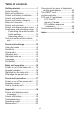 Table of contents Getting started...............................1 Parts checklist..................................1 Baby unit installation........................2 Parent unit battery installation..........3 Parent unit installation......................5 Parent unit battery charging.............6 Baby unit overview...........................7 Parent unit overview.........................8 Parent unit display screen icons......9 Positioning and operating range....10 Positioning the audio monitor...