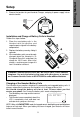 2. Choose the location for your Handset Charger, and plug its power supply into an electrical outlet. To AC outlet Installation and Charge of Battery Cells in Handset Follow the steps below: 1. Place the new battery cells in the Handset with the positive and negative poles aligned in the battery compartment. 2. Replace the battery cover by sliding it upwards 3. If the new battery cells are not already charged, place the Handset in its Charger or Base Unit, and allow it to charge for 10-12 hours.