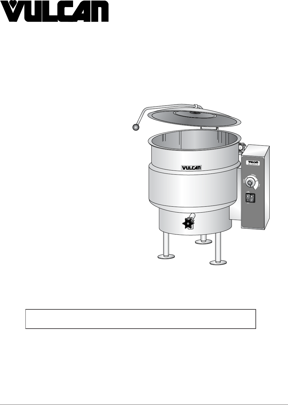 INSTALLATION & OPERATION MANUAL ELECTRIC STATIONARY AND TILTING KETTLES MODEL 30 60 90 120 0 30 Hg vac 150 psi MIL K20EL 136073 K40EL 136074 K60EL 136075 K20ETL 136077 K40ELT 136078 K60ELT 136079 K40EL For additional information on Vulcan-Hart or to locate an authorized parts and service provider in your area, visit our website at www.vulcanhart.com VULCAN-HART DIVISION OF ITW FOOD EQUIPMENT GROUP, LLC WWW.VULCANHART.COM 3600 NORTH POINT BLVD.