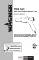 Heat Gun Hot Air Paint Removal Tool Owner’s Manual Read all instructions and product labels. When using electrical tools, follow all precautions to reduce the risk of fire, electric shock, and other personal injury. Need help? Call us first for answers fast. Call Wagner toll-free if you have any comments or problems with this Wagner product. 1-800-727-4023 Wagner Technical Service Register your product online at: http://www.wagnerspraytech.