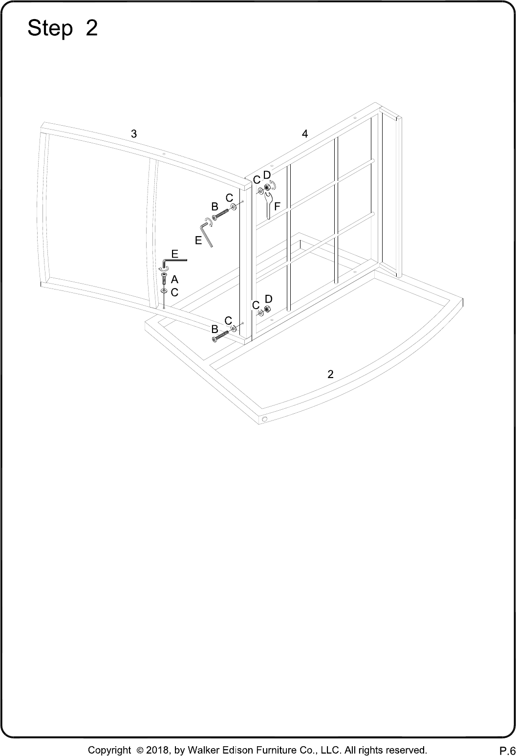 Attach part (3) to part (2, 4) using bolt (A, B), nut (D) and washer (C) with hex key (E)