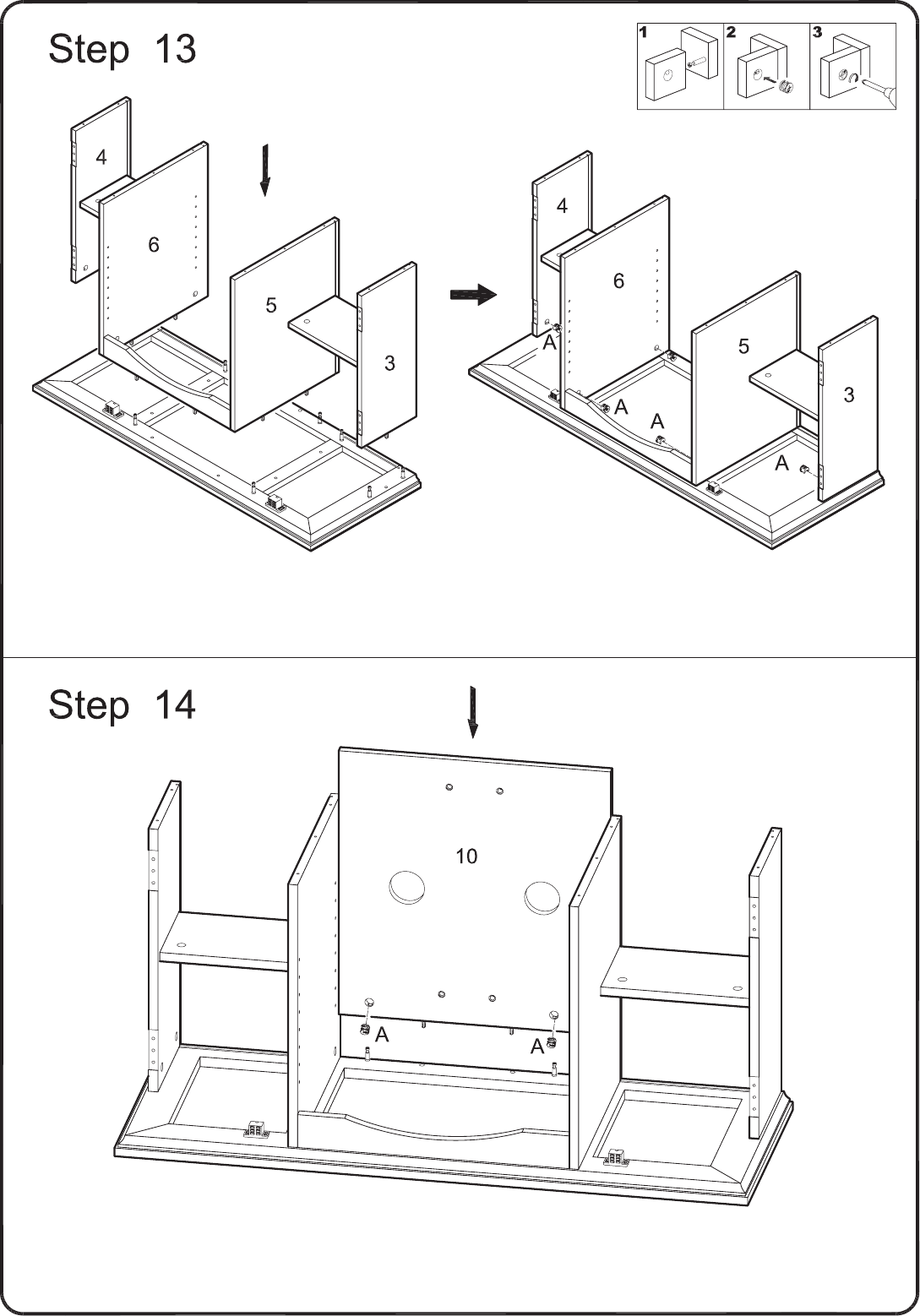 Insert cam locks (A) into panels (3,4,5,6) and tighten with a screwdriver. Note that two cam locks will be