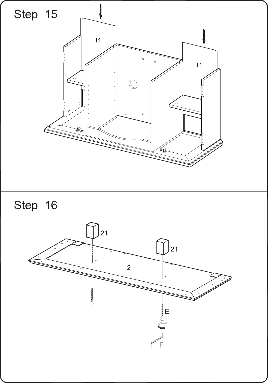 Attach stand supports (21) to stand base (2) using bolts (E). T