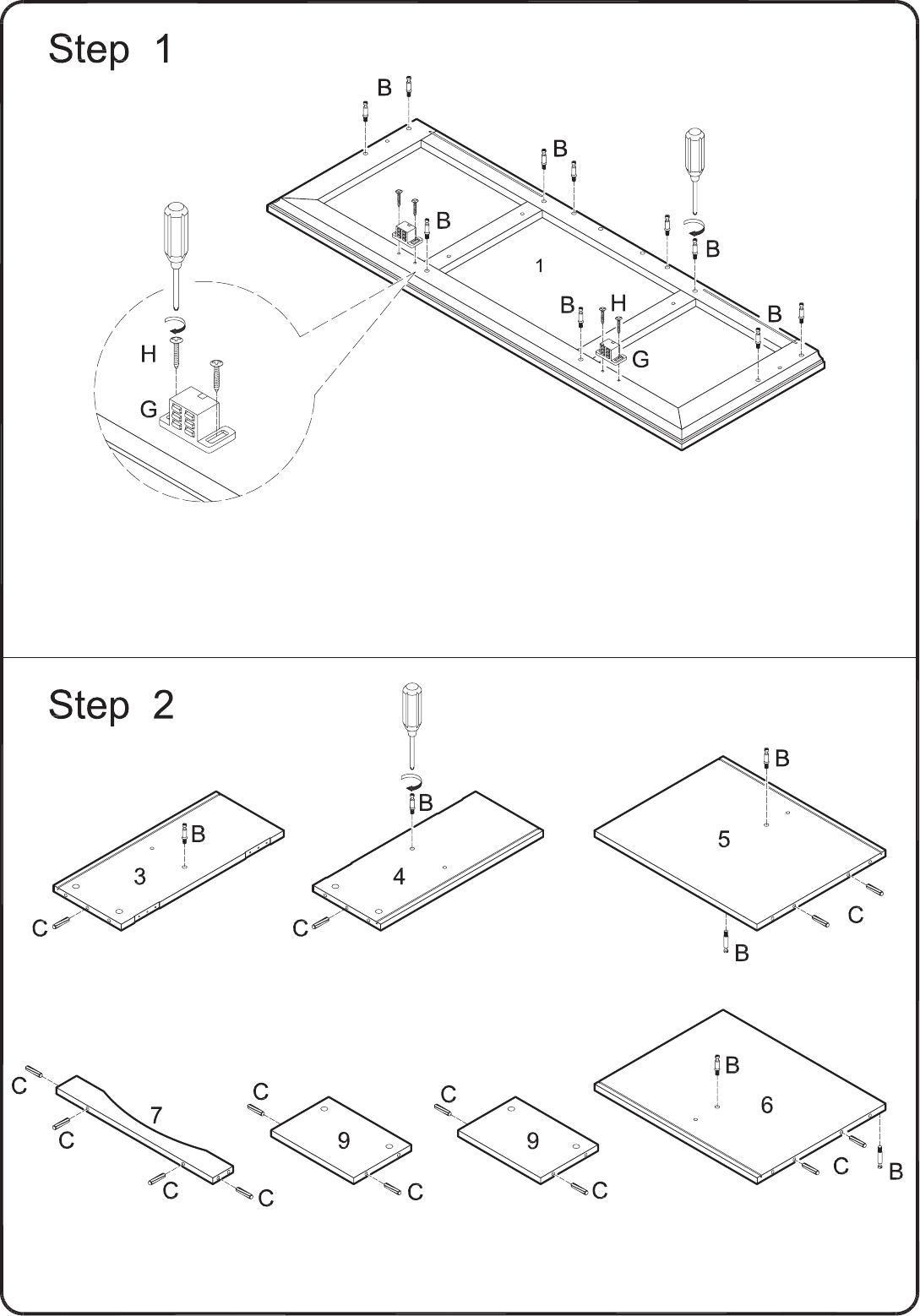 Screw cam bolts (B) into panels (3,4,5,6). Note that a cam bolt will be screwed into each side of panels (5,6).