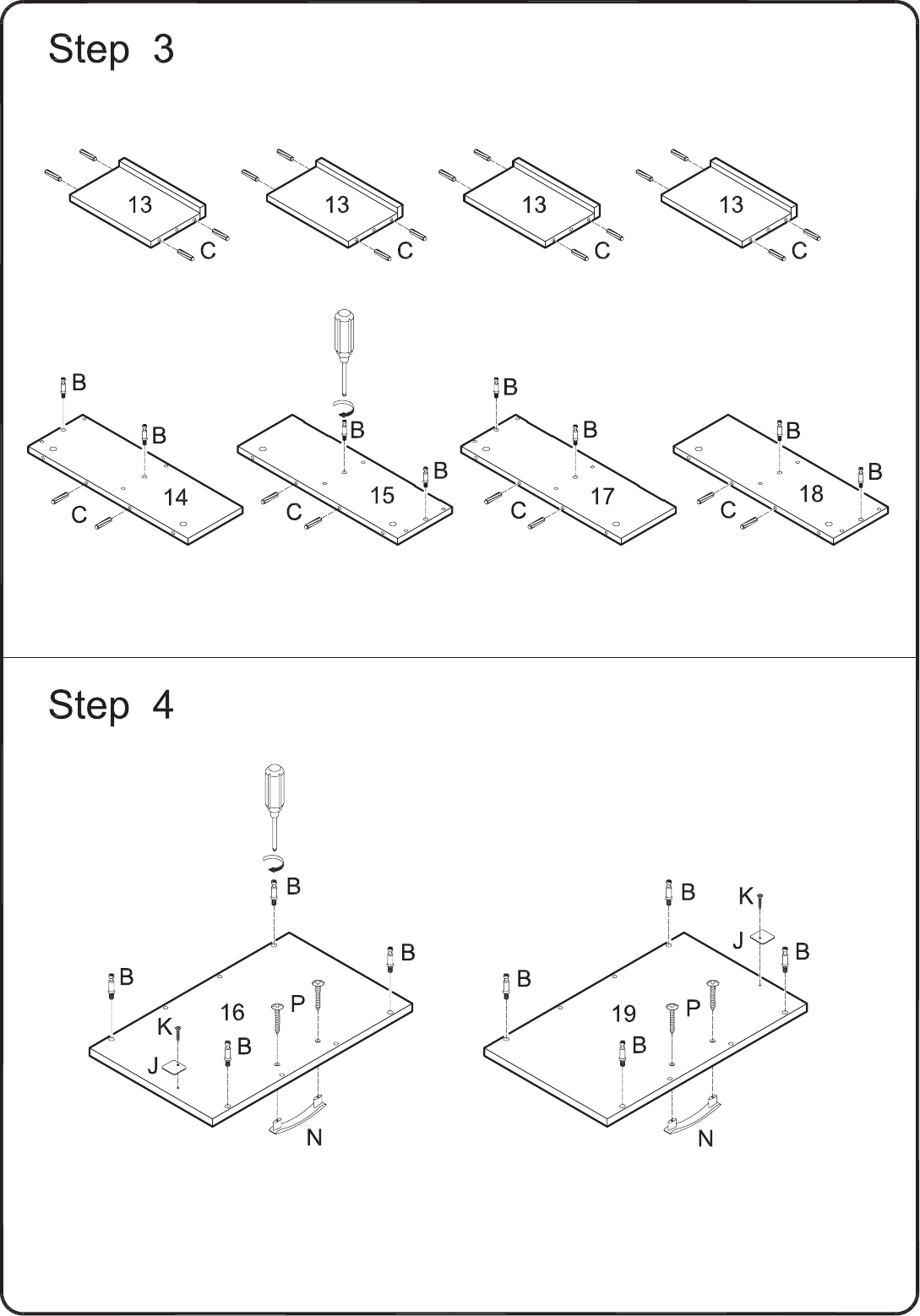 Insert dowels (C) into shelves (13) and panels (14,15,17,18). Screw cam bolts (B) into panels (14,15,17,18).