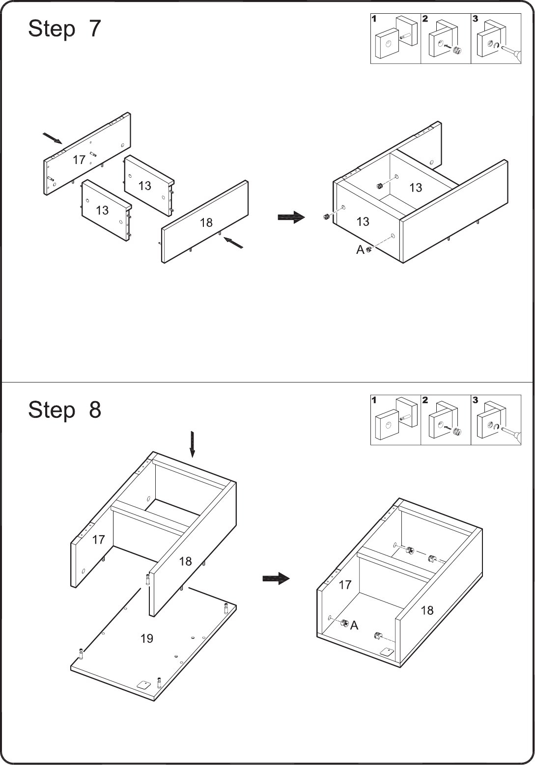 Attach panels (17,18) to the second set of shelves (13) using cam bolts and dowels as guides. Insert cam