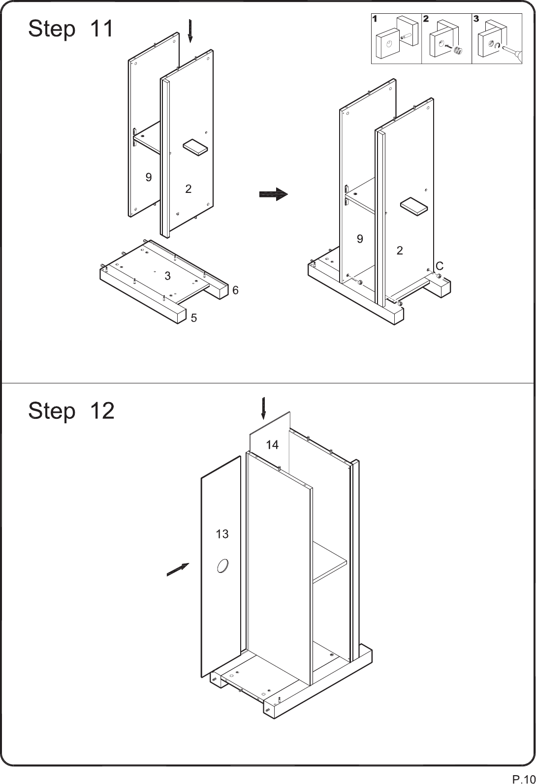 Insert cam locks (C) into panel (2) and shelf (9) and tighten with a screwdriver. Two cam locks will be inserted
