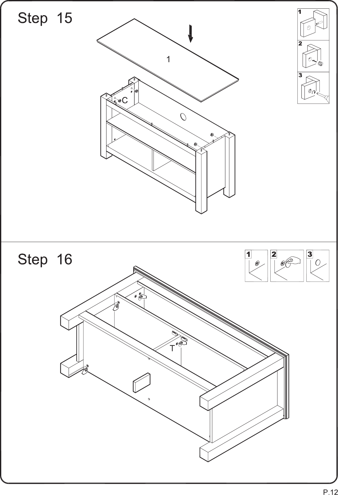 Attach top panel (1) to the frame assembly using cam bolts and