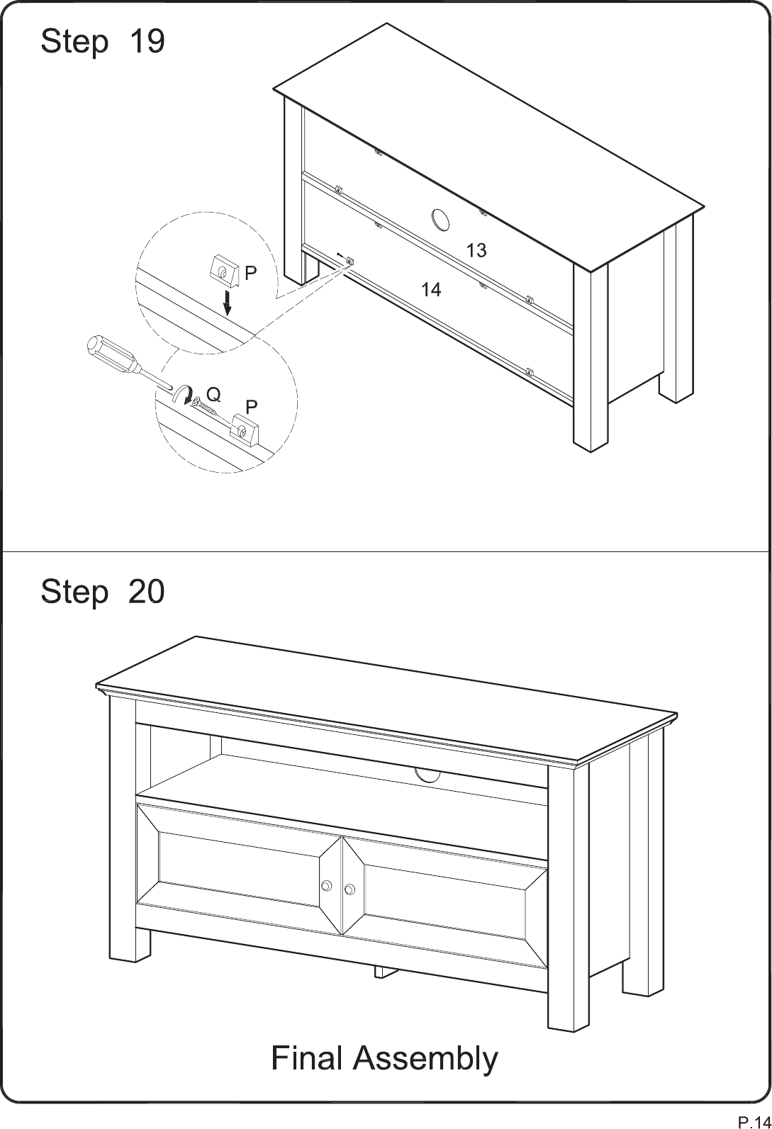 Secure back panels (13,14) using plastic wedges (P) and large screws (Q).