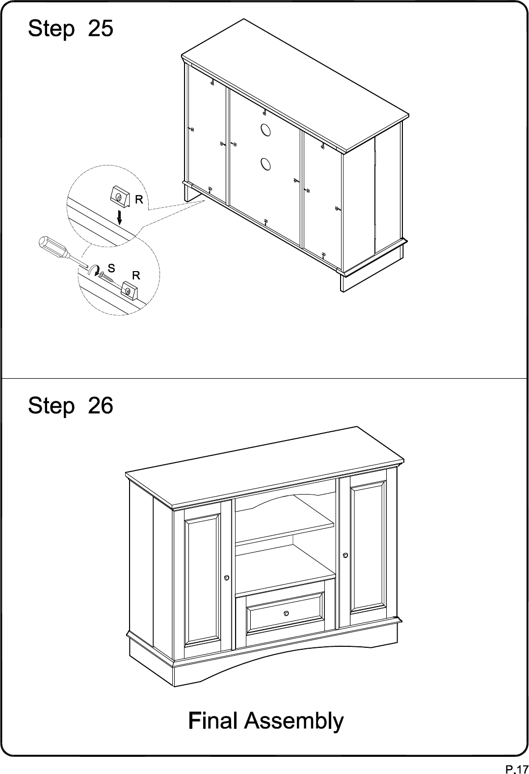 1) using plastic wedges (R) and medium screws (S).