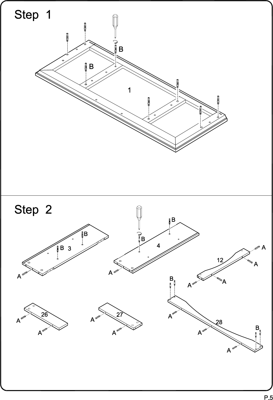 Screw cam bolts (B) into panels (3,4) and slat (28). Insert dowels (A) into panels (3,4) and slats (12,