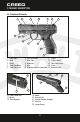CREED 2 DESCRIPTION DU PRODUIT 2 DESCRIPTION DU PRODUIT 2.1 Caractéristiques Le CREED est un pistolet semi-automatique avec chien extérieur. Ce pistolet est doté d’un indicateur de charge et de sûreté automatiques. Le dispositif de visée ouvert permet de viser rapidement la cible. La carcasse est composée de polymère ultra résistant et offre un rail pour les accessoires permettant de fixer une lampe ou un laser ou un autre appareil de ce type.