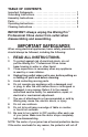 TABLE OF CONTENTS Important Safeguards . . . . . . . . . . . . . . . . . . . . . . . . . . . . . . . . Grounding Instructions . . . . . . . . . . . . . . . . . . . . . . . . . . . . . . . Assembly Instructions . . . . . . . . . . . . . . . . . . . . . . . . . . . . . . . . Parts . . . . . . . . . . . . . . . . . . . . . . . . . . . . . . . . . . . . . . . . . . . . . . Operating Instructions . . . . . . . . . . . . . . . . . . . . . . . . . . . . . . . . Cleaning Instructions . . . . . . . . . . . . . .