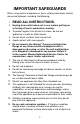 IMPORTANT SAFEGUARDS When using electrical appliances, basic safety precautions should always be followed, including the following: 1. READ ALL INSTRUCTIONS. 2. Unplug from outlet when not in use, before putting on or taking off parts and before cleaning. 3. To protect against risk of electric shock, do not put appliance in water or other liquids. 4. Do not touch surfaces that may be hot. 5. Avoid contact with moving parts. 6.