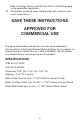 heat-insulating material, and that the closest attention be paid to fire-prevention regulations. 32. Be cautious of boiling water. Boiling water will scald skin and cause severe burns. SAVE THESE INSTRUCTIONS APPROVED FOR COMMERCIAL USE The pasta cooker does not contain any user-serviceable parts. Please contact a Waring Authorized Service Center for any repairs, or phone Waring Customer Service 1-800-4-WARING. Do not remove any components or service panels on this product.