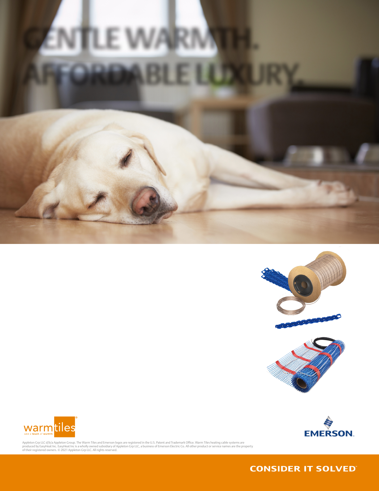Appleton Grp LLC d/b/a Appleton Group. The Warm Tiles and Emerson logos are registered in the U.S. Patent and Trademark Ofce. Warm Tiles heating cable systems are