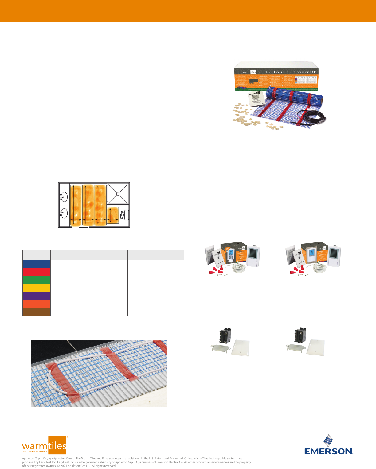 Appleton Grp LLC d/b/a Appleton Group. The Warm Tiles and Emerson logos are registered in the U.S. Patent and Trademark Ofce. Warm Tiles heating cable systems are