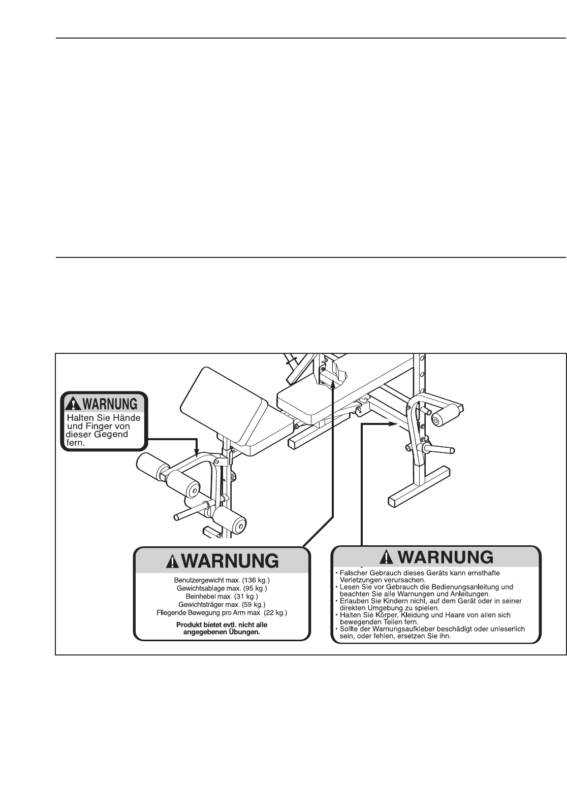 Die unten abgebildeten Warnungsaufkleber wurden an den angezeigten Stellen der Hantelbank ange-