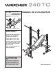 AVANT DE COMMENCER Merci d'avoir choisi le nouveau banc de poids WEIDER® 240 TC. Le banc de poids permet d'effectuer plusieurs exercices qui visent le développement des principaux groupes de muscles de la partie supérieure du corps. Que vous ayez comme but de raffermir votre corps, d'accroître considérablement votre masse musculaire ou votre force, ou simplement dʼaméliorer votre système cardio-vasculaire, le banc de poids vous aidera à atteindre vos objectifs.