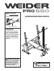VOORDAT U BEGINT heldsen, neem dan contact op met de winkel waar u dit product nebt gekocht. Het model nummer is WEEVBE2926.0. Het serie nummer staat op een sticker die op de gewichstbank (zie de voorste pagina van deze handleiding). Fijn dat u voor de WEIDER® PRO 550 opvouwbare gewichtsbank hebt gekozen. De gewichtsbank biedt een aantal gewichtsposities ontworpen om de belangrijkste spiergroepen van uw lichaam verder te ontwikkelen.