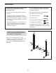 DE BARBELLHAKEN GEBRUIKEN Om gewichten toe te voegen of te verwijderen (niet meegeleverd) terwijl uw barbell (niet meegeleverd) is bevestigd aan de Staanders (1), dient u de Barbell vast te maken door de Barbellhaken te draaien (32, 33) over de barbell. Dit vermindert de kansen dat de barbell zal vallen als u gewichten wisselt. 32 1 WAARSCHUWING: 33 plaats niet meer dan 95 kg op de gewichtsteunen.