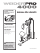 ANTES DE COMENZAR Para su beneficio, lea el manual cuidadosamente antes de usar la máquina para correr. Si tiene preguntas después de leer este manual, por favor vea la portada de este manual. Para ayudarnos a asistirlos, anote el número de modelo y el número de serie del producto antes de contactarnos. El número del modelo y la ubicación del número de serie se muestran en la portada de éste manual. Gracias por seleccionar este versátil sistema de entrenamiento WEIDER® PRO 4000.
