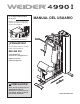ANTES DE COMENZAR tiene preguntas después de leer este manual, por favor vea la portada de este manual. Para ayudarnos a asistir le, anote el número del modelo del producto y el número de serie antes de conactarnos. En la portada de este manual se muestran el número del modelo y la ubicación de la calcomanía con el número de serie. Gracias por seleccionar el versátil sistema de entrenamiento WEIDER® 4990 I.