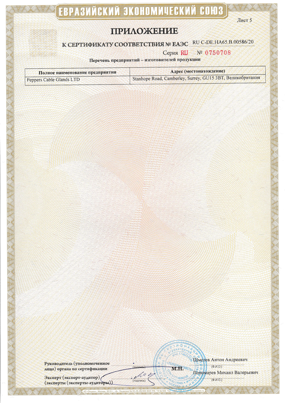 Approval/Certificate/Document of Conformity