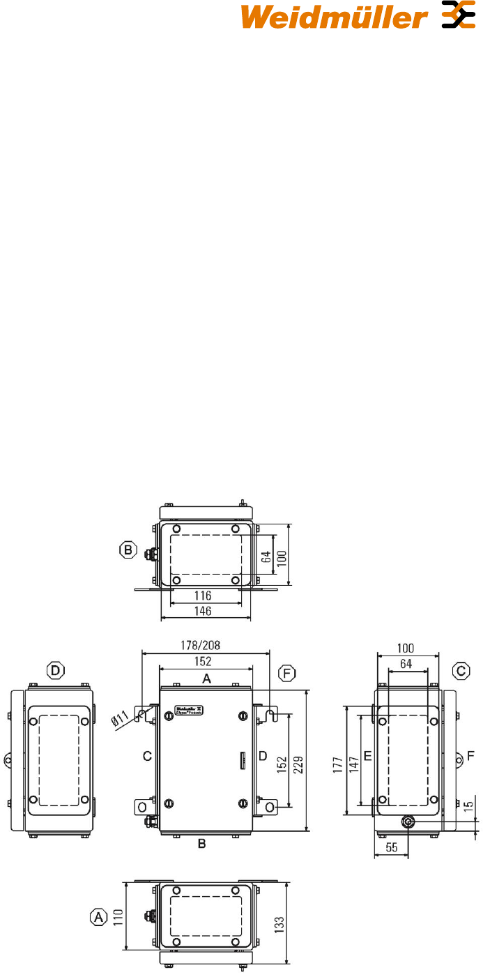Gehäusebefestigung: 4 Montagefüße mit 11 mm Lochgröße, 2 davon geschlitzt, angeschweißt
