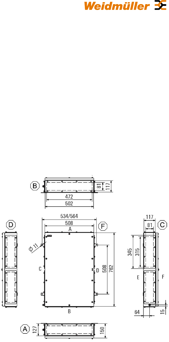 Gehäusebefestigung: 4 Montagefüße mit 11 mm Lochgröße, 2 davon geschlitzt, angeschweißt