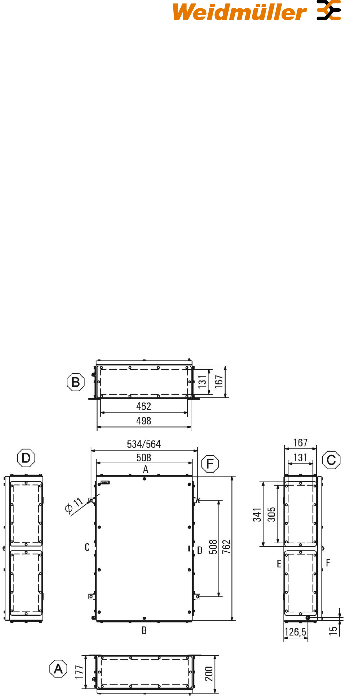 Gehäusebefestigung: 4 Montagefüße mit 11 mm Lochgröße, 2 davon geschlitzt, angeschweißt