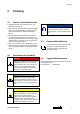 Sicherheitsanweisungen 3. Sicherheitsanweisungen 3.1 Sicherheitshinweise VORSICHT! HINWEIS Ein Bedienungsfehler kann zu schweren Verletzungen des Bedieners oder zu Schäden an der Ausrüstung führen. • Lesen Sie das Handbuch sorgfältig vor der Installation und Wartung durch, damit ein ordnungsgemäßer Betrieb gewährleistet ist. • Machen Sie sich vor der Verwendung mit der Ausrüstung sowie mit den Sicherheitshinweisen und Anweisungen vertraut.