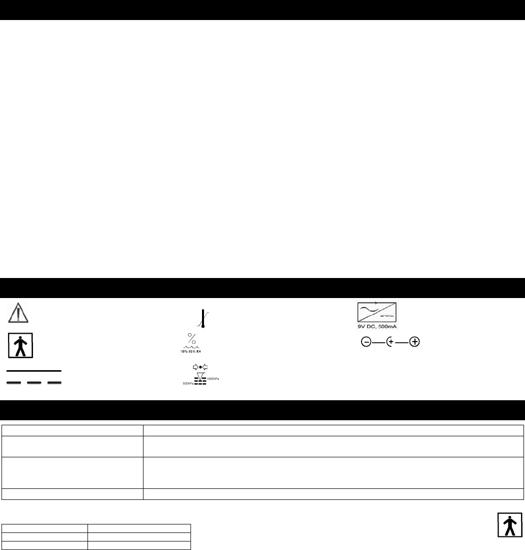 Complies with UL Std No. 60601-1. Type BF applied parts. Internally